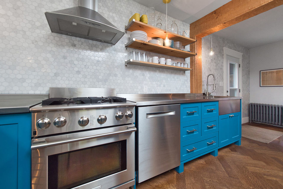 The beautiful herringbone oak floors, original doors and trim, and custom lighting set the tone, while the cook's kitchen with stainless-steel counters, Electrolux stainless-steel appliances with gas range, kitchen island with marble counter, unique library-card storage end, and chef-style kitchen faucet will impress you and your visitors time and time again. Dine in and make the most of the breakfast-nook-turned-dining-table.